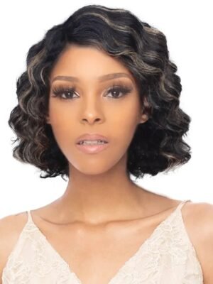 This curly wave style wig, has a 5” deep lace centre parting. Available, in a few colourful ombre and base colours, this lace front wig also features baby hairs and can be heat styled.