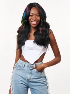A loose crimped curly style wig in this mid length style. With a lace front and centre parting this wig has a very natural finish.