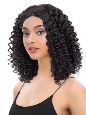 Mid-length curly style wig with curtain bangs. Styled in a lace middle parting.