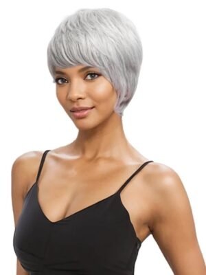 Stylised pixie crop style, with cuts and layers styled at the crown of this wig.