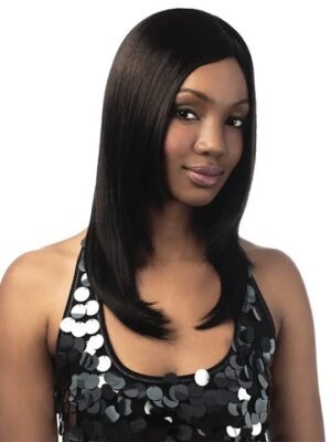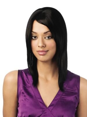 Silky straight, shoulder length wig with razored ends, a centre parting & layers around the face.