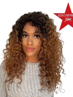 Very full tight curl pattern. Kinsley has that curly rounded style in a shoulder length, featuring a short fringe style.